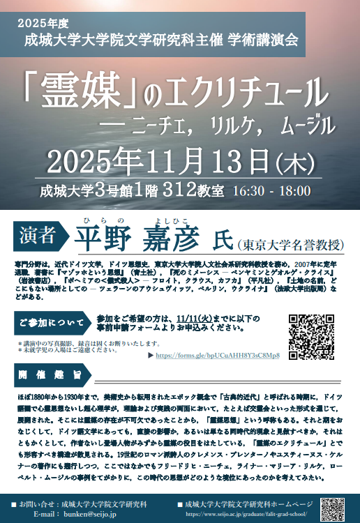 11/13(木)【成城大学】大学院文学研究科主催 学術講演会「霊媒」のエクリチュール— ニーチェ,リルケ,ムージル